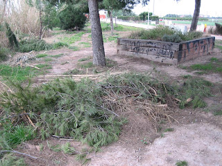 Restes acumulades de branques, brossa i altres a la zona verda del carril bici.