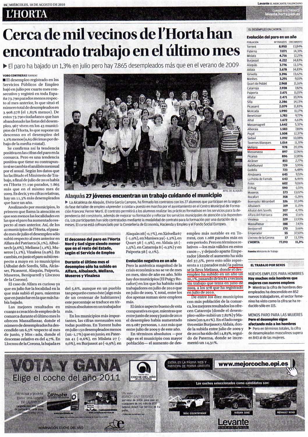 Tal com avançàvem a l’inici de l’agost, la desocupació a Meliana ha crescut més que en cap altre poble de l’Horta en l’últim any, un 20,15%, tal com recollia en un estudi comparatiu el diari Levante-emv, el 18 d’agost. Es confirmen, per tant, els pitjors presagis, constatats pel BLOC des de fa mesos, i també la nul·la capacitat del govern popular de Blas Devís d’activar polítiques municipals per a contrarestar els efectes de la crisi econòmica, especialment la desocupació. Ara més que mai, s’evidencia la falta de perspectiva política dels populars, que van renunciar a la subvenció de 445.000 € de la Generalitat i al projecte d’execució del viver d’empreses. Un projecte del govern anterior del BLOC que, de segur, haguera ajudat, i molt, a crear ocupació i empreses, a augmentar la formació laboral i a millorar l’assessorament tècnic als empresaris, als comerciants i als autònoms per a fer front a estos temps difícils. Es demostra que per a l’alcalde Blas Devís no és important apostar per projectes innovadors i de foment dels sectors econòmics i de l’ocupació.