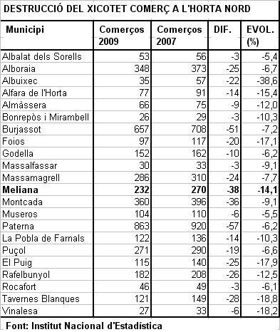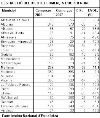 Diumenge passat, 31 d’octubre, Levante-emv publicava les dades de destrucció del teixit empresarial que afecta el xicotet comerç. Dades de l’Institut Nacional d’Estadística que en el cas de Meliana de nou són especialment preocupants. Així, si la mitjana de la CV quant al tancament de comerços entre el 2007 i el 2009 ha sigut d’un 8,1%, en el cas de Meliana ha sigut del 14,1%. S’han vist obligats a tancar 38 comerços, molt per damunt de municipis també amb un sector comercial important, com ara Massamagrell, Montcada, Alboraia, Godella, Burjassot o Paterna.