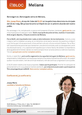 Carta de presentació de Josep Riera com a candidat a l’alcaldia