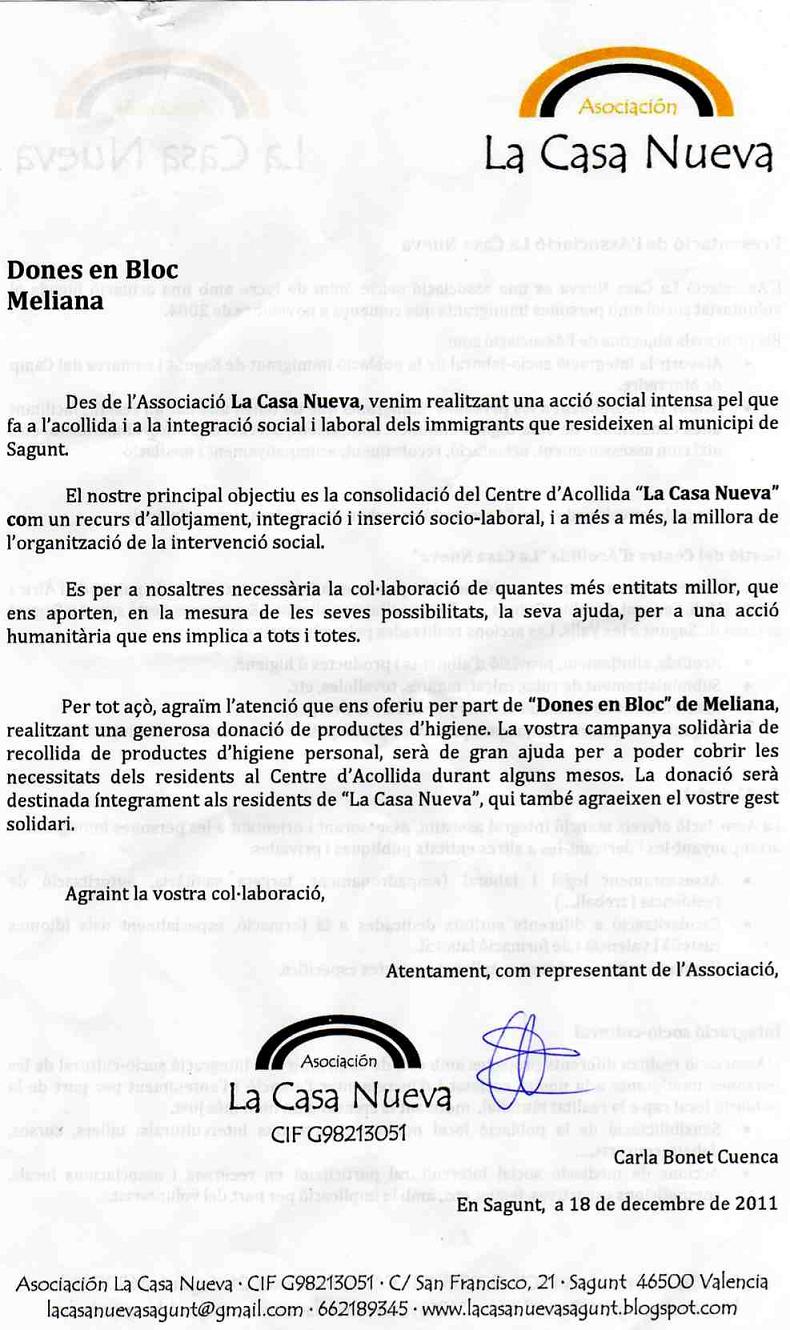 General 3 gener 2012Reproduïm una de les cartes d’agraïment de les associacions que han rebut l’ajuda de la campanya solidària de Dones en Bloc. Teniu més informació en els enllaços següents:http://lacasanuevasagunt.blogspot.com/http://www.guiaongs.org/directorio/ongs/la-teua-llar-valencia-5-1-156